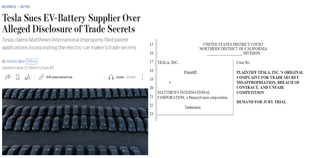 All was well until Matthews allegedly used this proprietary information to file their own patent applications attempting to claim ownership and inventorship of Tesla's trade secrets. This led to the public disclosure of a subset of Tesla's extremely valuable technology, causing direct and serious harm to Tesla’s business. Since discovering Matthews’ improper conduct, Tesla has been working to block and delay publication of the affected applications, and only a subset of Tesla’s confidential information regarding dry-electrode manufacturing has been published thus far.